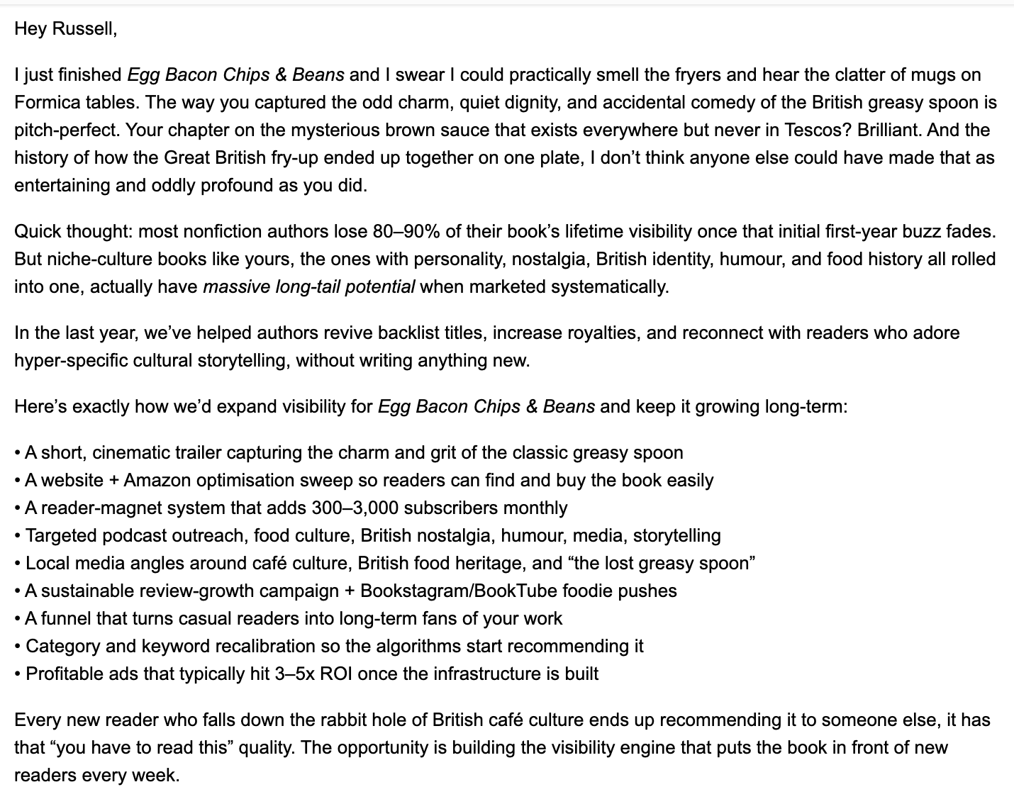 Quick thought: most nonfiction authors lose 80–90% of their book’s lifetime visibility once that initial first-year buzz fades. But niche-culture books like yours, the ones with personality, nostalgia, British identity, humour, and food history all rolled into one, actually have massive long-tail potential when marketed systematically.